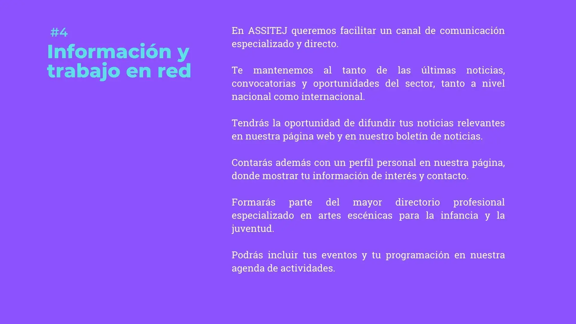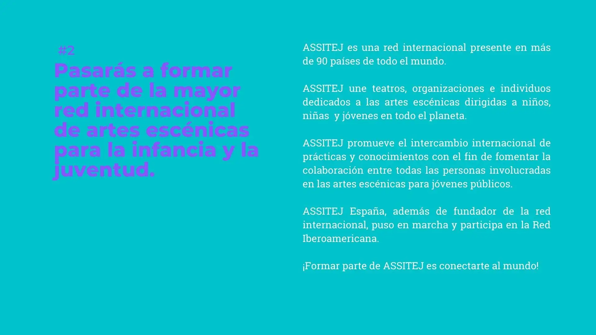 - Tendrás posibilidad de ponerte en contacto con otros socios y socias de ASSITEJ.